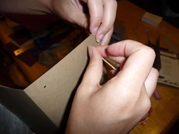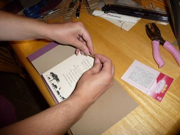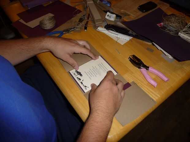 Tire del hilo a través de dos orificios en la invitación para que usted puede atar en el interior. Atarla viejo quieras pero decidimos girar juntos y les Tire firmemente.