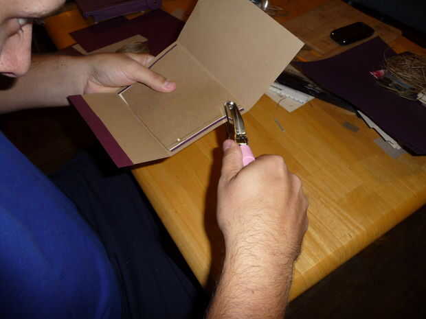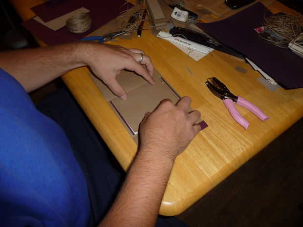 Centro de la parte superior de la invitación al fondo y entre los pliegues. Luego tome un pedazo de papel del mismo tamaño que la invite y marca donde usted perforar agujeros. Con este punzón de guía los agujeros. La guía hace dos cosas hace tu invita consistente y también impide la perforadora haciendo un anillo como sello alrededor del agujero.