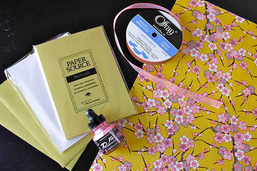 Tinta de Blick y también verdes planas tarjetas, blanca plana, verdes sobres y papel de flor de cerezo de papel. (La cinta vino de mis cintas de o caja gigante pero creo que lo tomé hasta abajo en el mercado de las flores en el centro de LA.)