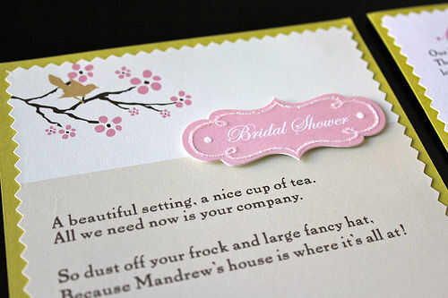 Entonces usé mis tijeras dentadas y corte de 1/8" completamente montado, las cartas (una por cada lado) en verde 5 x 7 con puntos de pegamento y agregado el"Bridal Shower"etiqueta de cartulina.