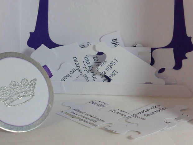 Estas invitaciones pueden parecer como habituales, pero cuando tus invitados abren las aletas se encuentran con pedazos del rompecabezas! Para saber donde y cuando la boda es necesita para armar el rompecabezas (no debería ser demasiado difícil ya que es sólo 9 piezas). Si usted desea conducir a los frutos secos siempre podrias poner la parte con el texto de la invitación a través de una trituradora de :D