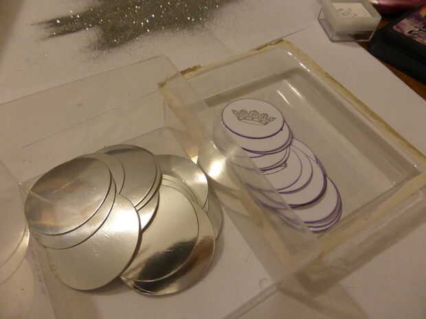 Sello de la corona con tinta de plata en tiras de papel blanco, luego rociar plata brillante gofrado polvo inmediatamente. Hacerlo en una tira de papel por lo que caben 4-5 coronas antes de que realza con una pistola de calor. Asegúrese de dejar espacio entre las coronas por lo que puede recortar círculos sin dañar las coronas de los alrededores.