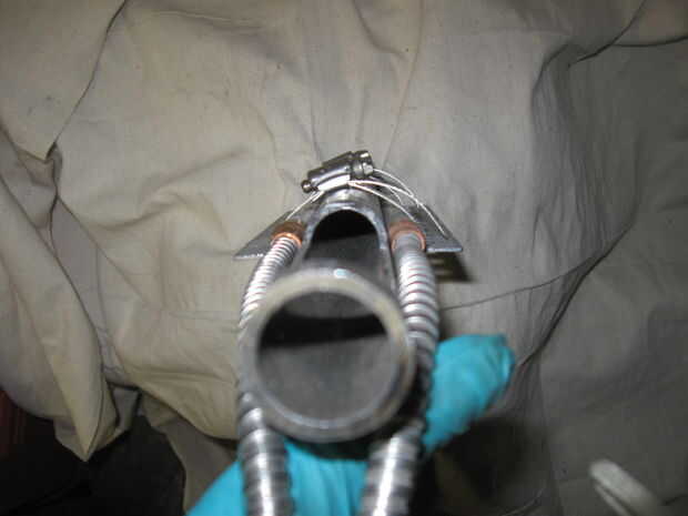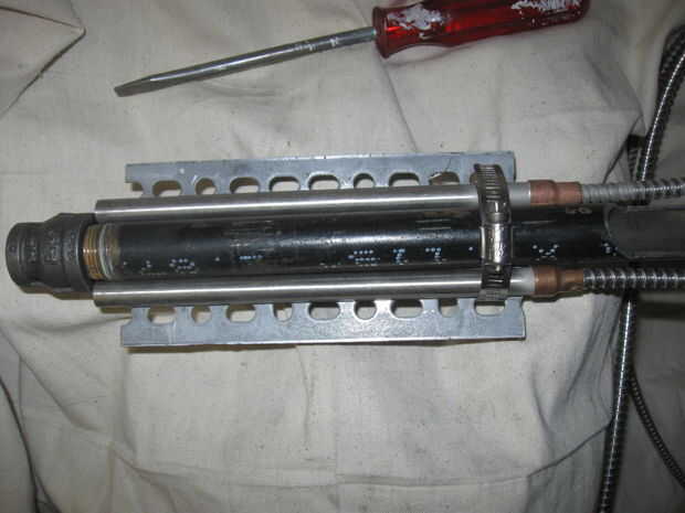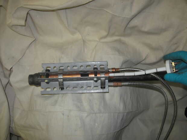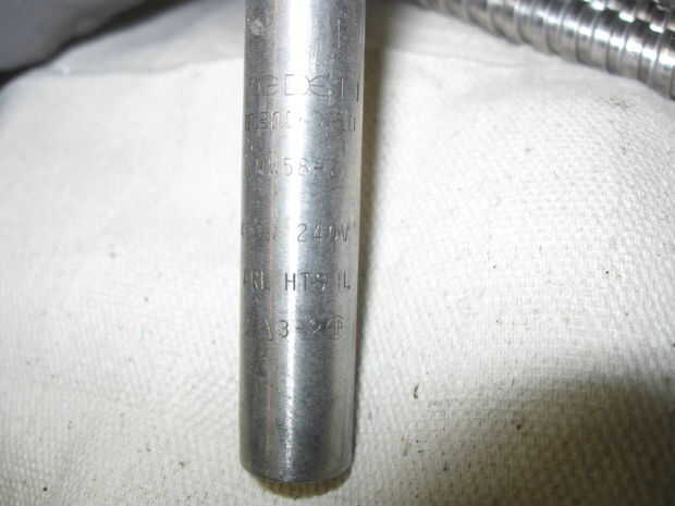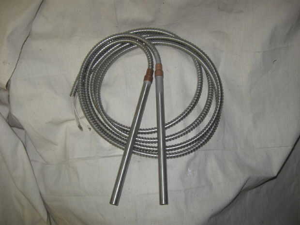 La calefacción proviene de 2 resistencias por calificaciones de Ogden de 400W a 240V. Estos fueron comprados de eBay en $1,00. Usted necesitará 2 en esta clasificación. Otros están disponibles en varios precios... la longitud de estos determinará la longitud entera del cuerpo del inyector como se muestra en las fotos. El calentador funcionará toda la longitud del cuerpo del inyector a continuación el puerto de entrada de plástico que fue cortado antes.