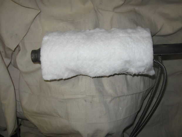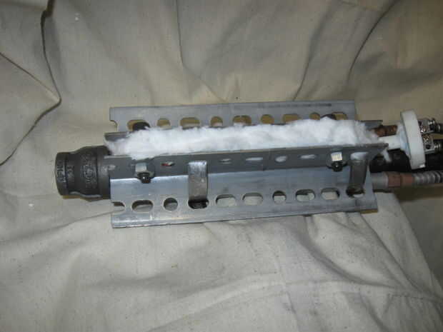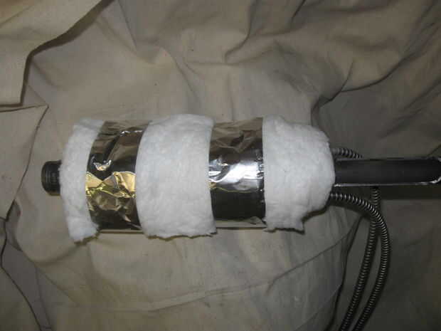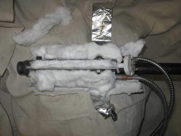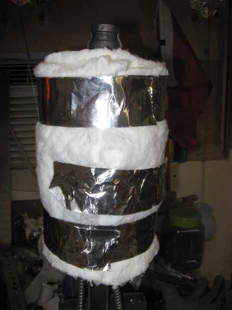 Todo el conjunto se envuelve con material de aislamiento de calor de vidrio de fibra que se encuentra disponible en casas de fuente de cerámica más. Esto reduce pérdida de calor y permite el calentamiento más rápido. Es necesario y reducirá la posibilidad de lesiones y en el futuro sea más económico. El aislamiento se envuelve y se mantiene en su lugar con cinta de aluminio que está disponible en los minoristas más grandes de la caja...