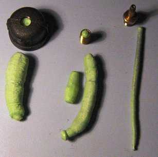 En la foto a continuación son 3 boquillas diferentes y las piezas que producían. También, en la foto es una pieza muy áspero moldeado por inyección que produje inyectando con el niple de latón de 1/8"-27 MIP en un manguito de cobre de 1/2". No es muy buena calidad porque no utilizo suficiente presión en el manguito.