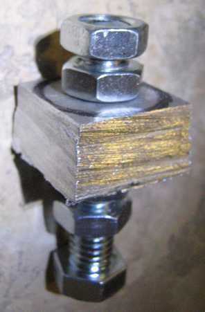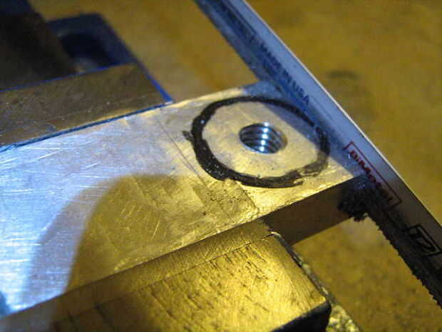 En cuanto a paso #2, la pieza es asegurada por dos tuercas a cada lado. Dos tuercas además mantienen las tuercas de unjamming. Las tuercas son tuercas sólo uno contra el otro tenga cosas de desenroscar. Luego puede tomar este adaptador y mantenerla en la prensa por la cabeza del tornillo hexagonal. Esto le permitirá cortar en cualquier ángulo.