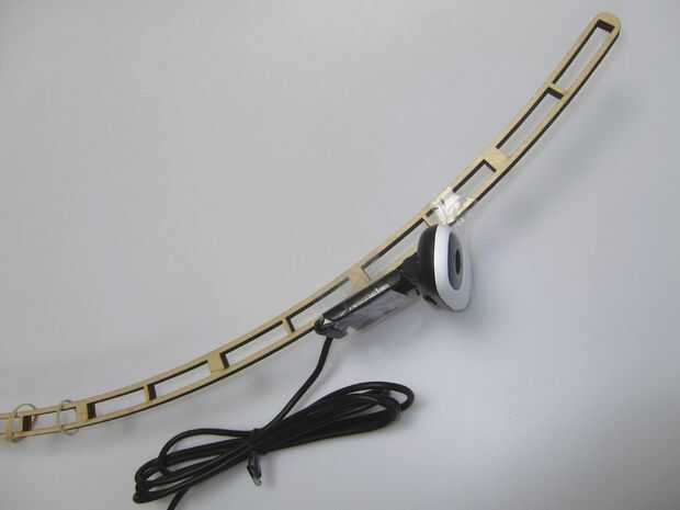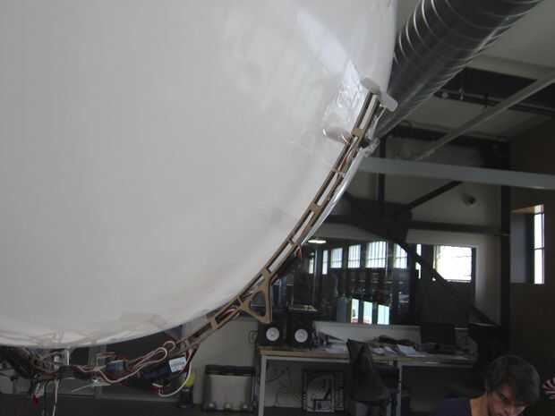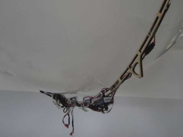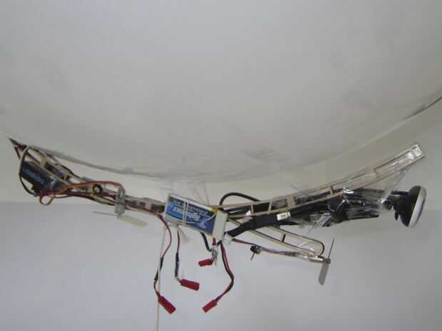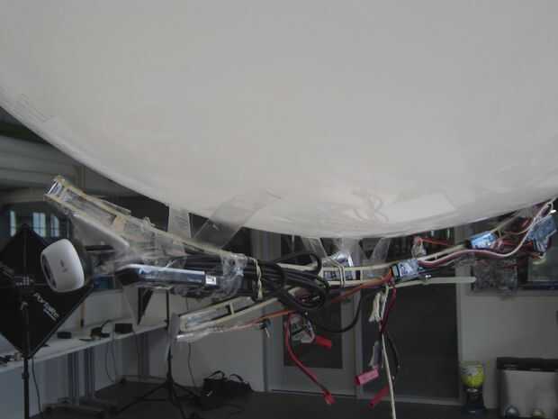 En esta etapa el marco se graba al balón en los tres lugares. El extremo posterior, con el rotor de cola, debe salir bastante alto y con suficiente distancia del globo que libremente el giro de la hélice. Otra vez, yo estaba esperando el balón a encogerse más. Un pequeño trozo de Depron puede ayudar a mantener la distancia necesaria.