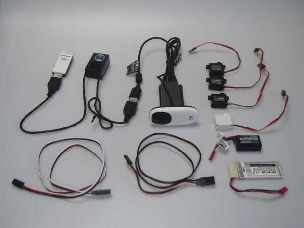 - 3 servos micro analógicos. Empecé con el Turnigy 1800A Servos de 8g, pero había substituido con un servo micro levemente más de gran alcance de Radio Shack. Después de esta construcción recomiendo servos ligeramente más potentes (como los de 13g).