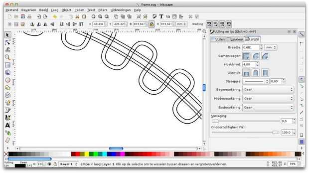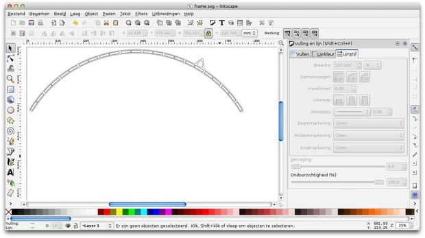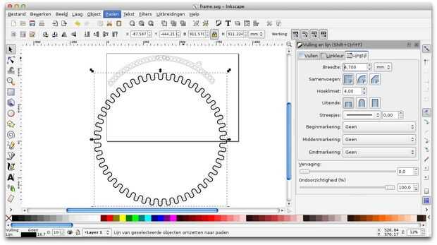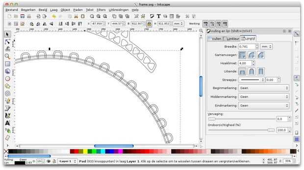 Diseñé el marco en Inkscape, pero tuve problemas para hacer un enrejado abierto basado en formas de baldosas. Así que cambié para hacer diseño basado en círculos que se intersectan con forma de "estrella" adaptado con mucho redondeados "picos". Guardé el resultado en formato pdf (añadido a este paso) para ir a la cortadora láser.