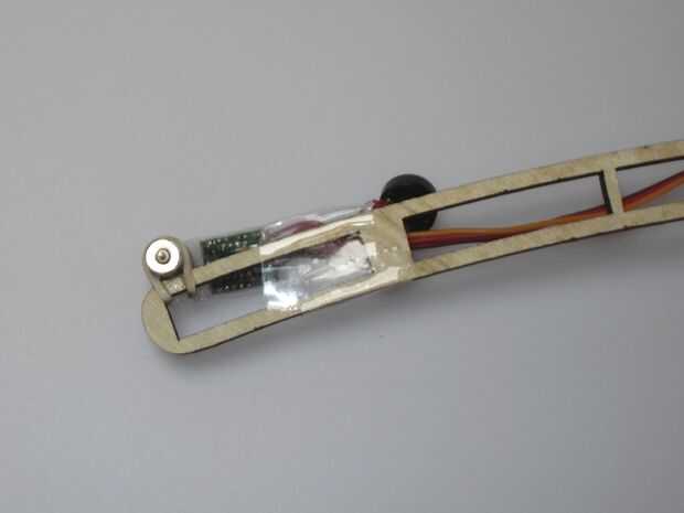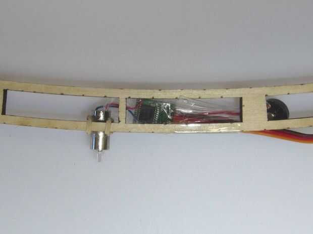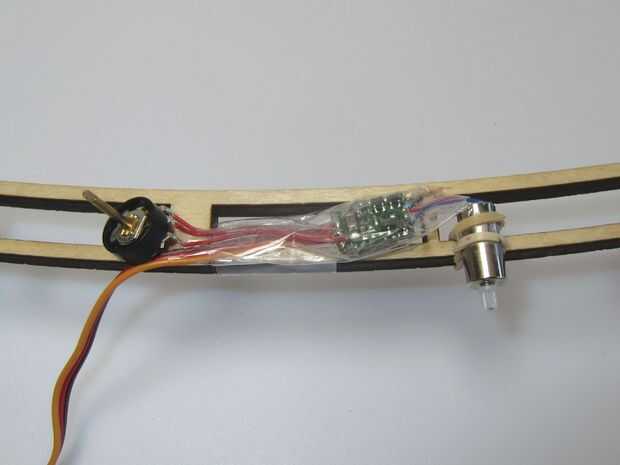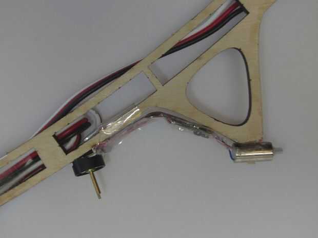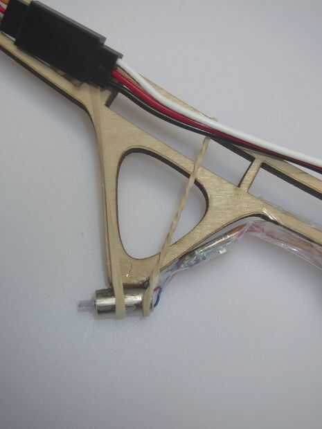 Los motores se unen al marco con algunos finales de bandas elásticas fijada con una gota de pegamento CA. Tenga cuidado de no para conseguir cualquier pegamento sobre el eje.