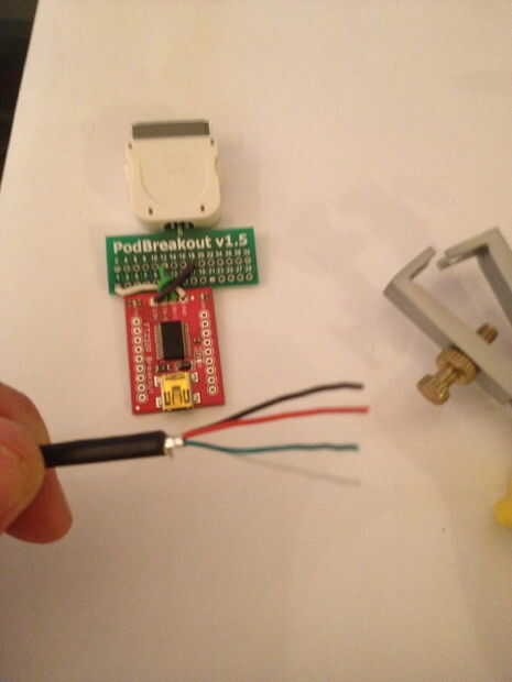 Tener un cable USB y cortar el conector mini USB (así que usted puede todavía conectarlo al ordenador en el otro extremo!). Tira el alambre de nuevo alrededor de 1 a 2 pulgadas así revela cuatro cables, debe ser verdes, rojo, blanco y negro. Tira un poco de alambre del extremo del cable negro. Ahora a soldar estos cables a la Junta de PodBreakout.