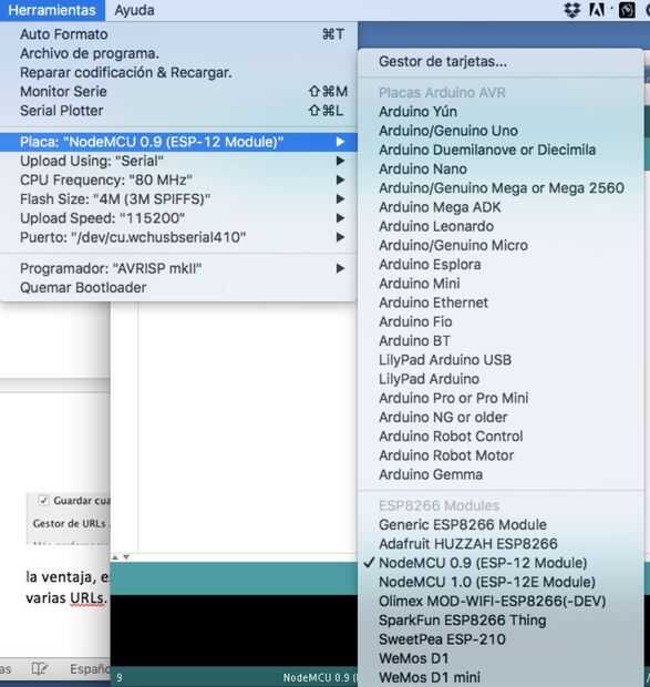 Es importante seleccionar otras características que están habilitadas para estos módulos, en la foto, se pueden ver los valores que estoy usando con placa ESP12