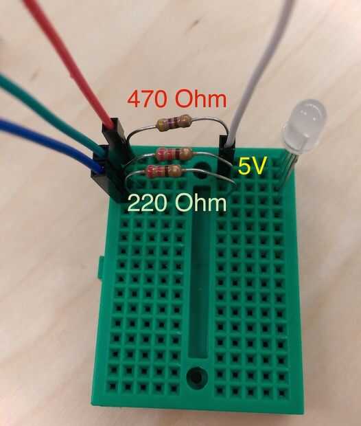 Consulte el diagrama del RGB LED arriba otra vez. Observe que el cable más largo obtiene 5V. Se puede decir que pin es rojo ya que es en el lado eso Perno largo que solo tiene un pin, no dos. Desde allí usted puede calcular hacia fuera verde y azul, están en el otro lado del perno largo. En la foto de arriba, el pasador largo es en la segunda fila de la parte superior, con el cable blanco. Tiempo para las resistencias. Dije que se necesita ~ 300 ohmios, pero aviso que uso dos resistencias diferentes. Usted puede jugar con qué combinación funciona mejor para usted, pero como regla general, la luz roja tiende a dominar el verde y el azul, así que poner una resistencia más fuerte para reducir la corriente que recibe. Cuando llegamos nuestra luz el siguiente paso, les mostraré como configurar en blanco. Si usted nota que los "blancos" se ve un poco rojo, puede cambiar la resistencia de entonces.