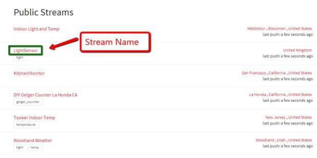 - Elegir una secuencia de la lista públicade Sparkfun. Algunos arroyos de ejemplo aparecen en la parte inferior de esta página. Haga clic en el nombre de la secuencia (ver foto arriba)