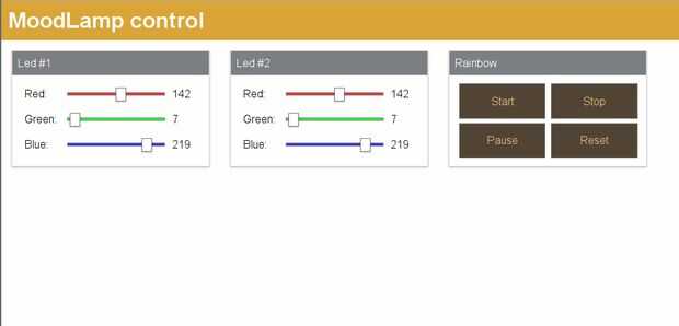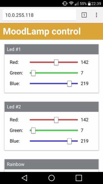 Si abres esta dirección en su navegador, debe recibir una página interactiva donde se pueden establecer el LED color y control de la animación del arco iris.