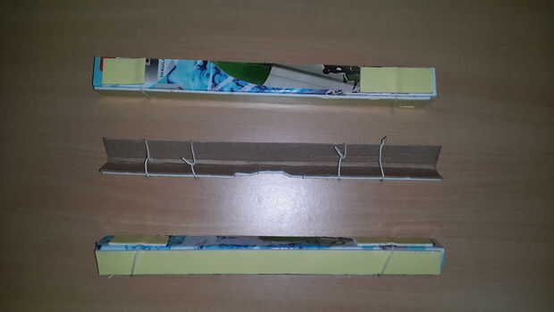 Para el montaje de la tira de LED, utilicé piezas de las esquinas de una caja de cartón. Jodido estas piezas en la parte superior del marco. Luego utiliza dos cintas echadas a un lado para pegar la tira llevada a las piezas de cartón. Y por último algunos cables para fijarlos correctamente.