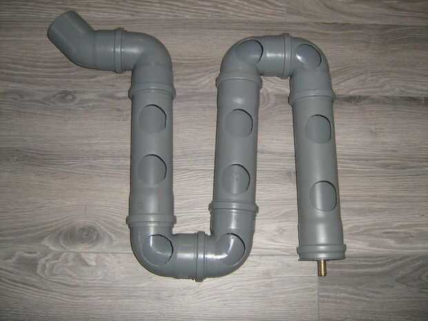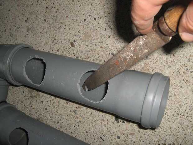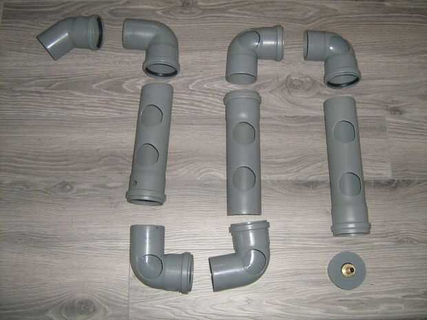 Primero perfore un agujero de 4 codos (90 grados) y dos agujeros en cada tubo de 30 cm, asegúrese de que hay al menos 5 cm de espacio entre los agujeros y tratar de distribuirlos uniformemente. Para aprovechar estos agujeros una herramienta de perforación y una sierra circular (50mm de diámetro), después de utilice una herramienta del raspador o cuchillo y papel de lija para suavizar los bordes de los agujeros. Estos agujeros tendrá contenedores de la planta.