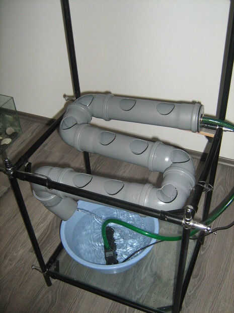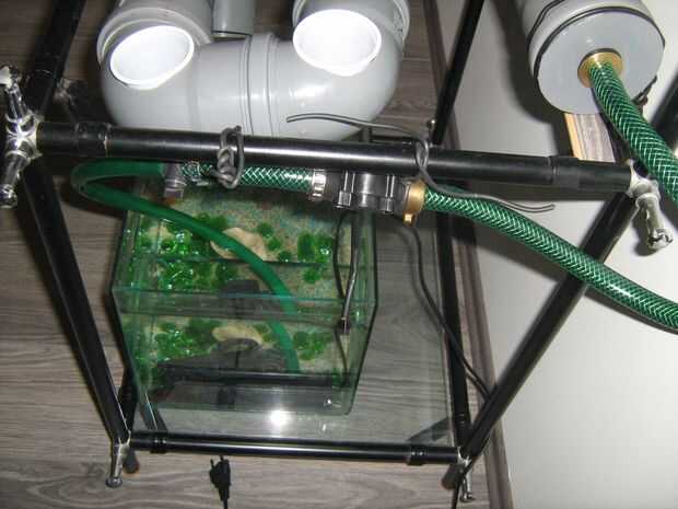 En este momento deben probar los tubos y las mangueras por fugas dejando la bomba para hacer circular agua a través del sistema durante al menos media hora (sólo poner algún recipiente de agua debajo de las tuberías). También cuando apagas la bomba, si el agua se queda en una parte de la quebrada ajustar las pistas para que toda el agua es drenado hacia el acuario.