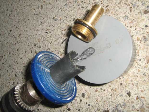 En el centro de la tapa de PVC taladrar un agujero de 26mm también en una sierra circular y un tornillo de la guarnición de cobre amarillo (1/2 '' 3/4 "x 1/2" lengüeta de la manguera para conexión de tubería macho).