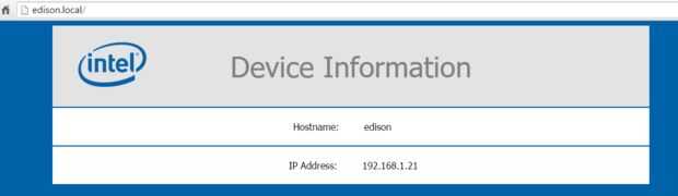 Nombre de dispositivo le permitirá acceder a dispositivo de navegador (en un ordenador conectado a su red local) sin IP escribiendo en "http://device_name.local/" (eg. "http://edison.local/"). Usted debe probarlo para asegurarse de que su trabajo vale, una sencilla página web con información del dispositivo (nombre de host y dirección IP) y debería aparecer el logo de intel.