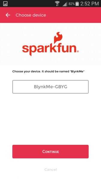 Desde la página de "Congrats!", golpeó configurar nuevo dispositivo, lea la lista de comprobación previa al vuelo y como siempre y cuando la placa de Blynk se enciende y parpadea el código de color único – golpear continuar. Esta siguiente página es donde seleccionas la placa de Blynk. Desplácese por la lista de dispositivos y seleccione una red namedBlynkMe-CCCC (uno puede ya ser seleccionado). Asegúrese de que ese sufijo de código de color coincide con la placa de Blynk RGB LED parpadeante.