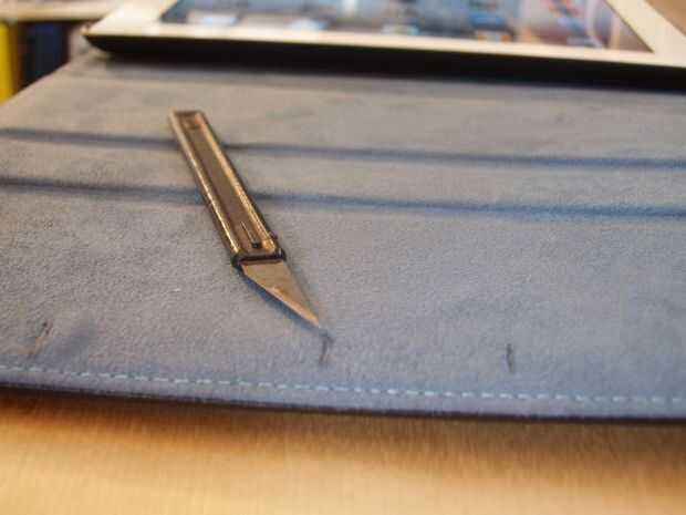 5) cuidadosamente Inserte el imán usando el cuchillo como una guía y levantar suavemente el cuero bolsillo abierto.