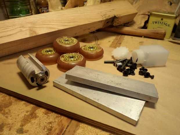 Construir un dispositivo de goma impulsado con ruedas de patines y un tambor reciclado de un avión, capaz de disparar flechas de carbono regular por lo menos tan potente como un arco compuesto de 50 libras.