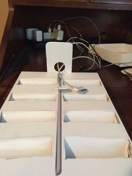Con otro iPhone insertar, o cualquier otro plástico rectangular surcada, cortar una ranura en la parte posterior de la caja de iPad y asegúrese de insertar la pieza con cinta adhesiva el inserto en el interior de la caja. Deslice todo el USB cables a través del orificio de carga y enchúfelos en un protector contra sobretensiones.
