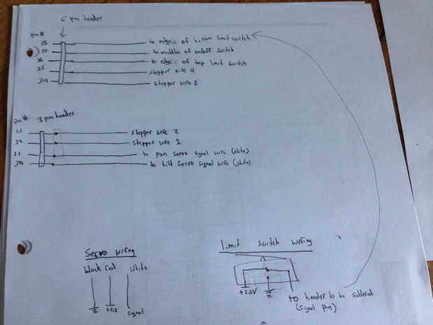 Nota: Se supone que un cable de señal del servo esté conectado al Pin 30 del WF32 (servo de la inclinación). El cable de señal del servo pan está conectado a Pin 31 del Consejo. Un motor paso a paso fue utilizado para el control de la altura en este proyecto, que fue colocada en las patillas, 32, 33, 34, 35. (Este código puede también cambiarse fácilmente para trabajar con un motor de corriente continua en lugar de otro). También en este proyecto, un interruptor de límite superior fue colocado en el Pin 36, que baja al pulsar. Un interruptor de límite inferior se colocó el Pin 38, que también baja al pulsar. También, un interruptor on/off se colocó en Pin 37, que debería ser normalmente alta y luego baja cuando en. Para cualquier control de entrada del sitio web de tener realmente un efecto, este interruptor ON/OFF debe activarse (es decir Pin 37 conducido bajo).