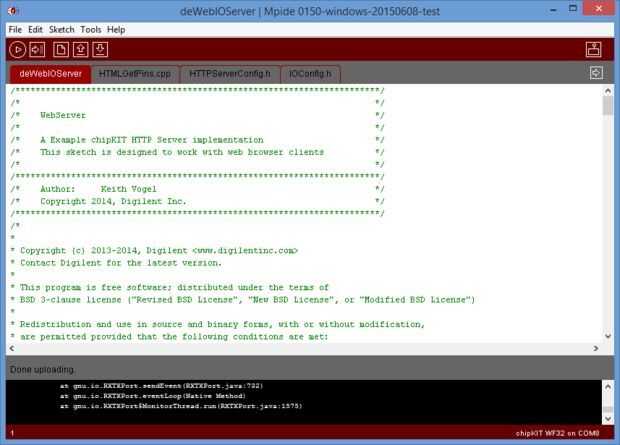 Abra el archivo llamado deWebIOServer.pde en MPIDE, clic sobre ella (si has usado MPIDE antes) o abrir primero MPIDE y haciendo clic en archivo -> abrir y busque el archivo descargado.