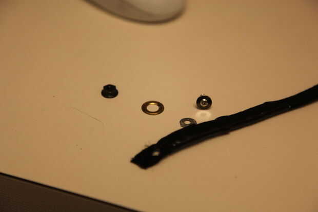 Un tornillo de cabeza plana y una arandela ojal, una pequeña arandela y una tuerca plana.