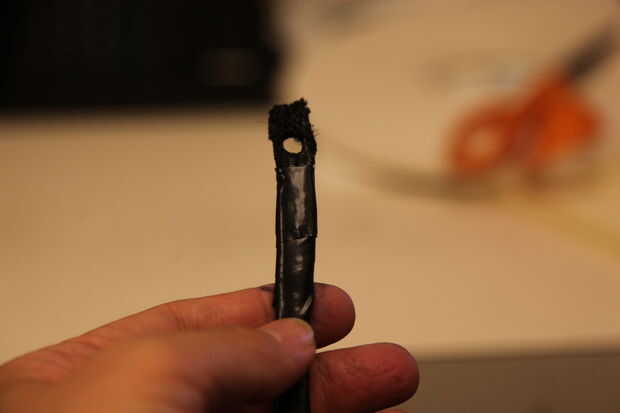 Una vez medido, utiliza unas pinzas de llama calentada, brad todo para hacer el agujero y enlace de la correa, Ser más geek, utiliza cinta de espuma doble palo (1/4") y cinta negra como re-enforcement.