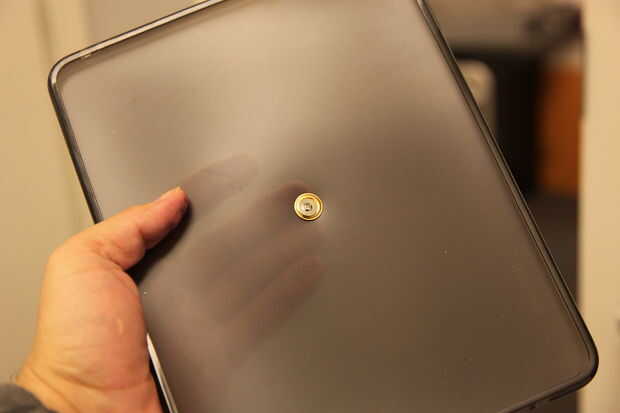 puse el tornillo y la arandela por la parte inferior de la cubierta del IPad