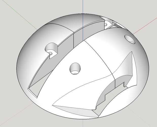 La decisión de usar SketchUp, un software de modelado no exactamente puede ser la mejor opción, ya que estaba apuntando para orgánicos, curvas formas y fuerza de este software radica en el enfoque de "líneas rectas" (sí, sé que hay una gran cantidad de addons que ayudan con las curvas, pero aún no es como trabajar con NURBS, etc.). El un addon, que básicamente salvar mi vida y la cordura (hasta cierto punto) se llama "inspector sólido". Tratándose de operaciones booleanas, SketchUp no parece preocuparse mucho por pequeños detalles como agujeros y crea superficies sobre otras superficies (incluso hasta siete o más capas en el mismo triángulo...) y este plugin te muestra exactamente donde hay un problema con la geometría. Esto es también muy importante al tratar con la impresión 3D ya que tienes que tener una geometría hermética y SketchUp no necesariamente produce tal con operaciones booleanas. (Aún así, la cúpula de dos piezas con hendiduras todas, las conexiones del tornillo y no se olvide acerca de un determinado espesor de pared, me llevó una semana corrigiendo y pintando triángulos... durante horas... y horas... v. e .r .r .y .e x... un... u... s... t... me... n... g…!!!)