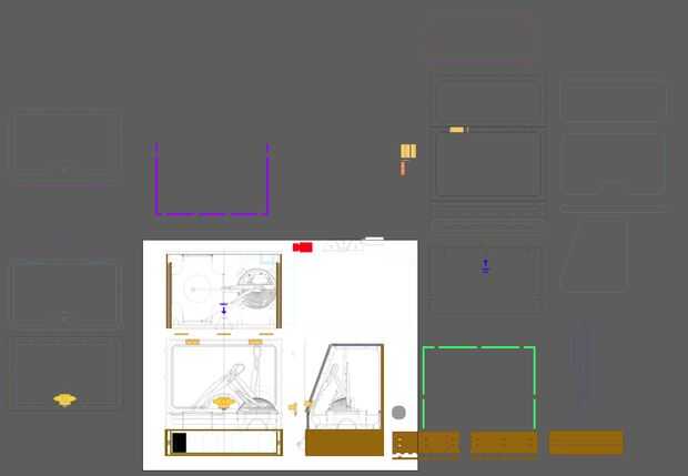 1) 3-vistas del robot de exportación de Sketchup. Se ha añadido copias de las piezas de brazos en diferentes posiciones para asegurarse de que habrá suficiente espacio en el gabinete para moverse.