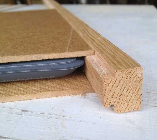 Usar un router y una mesa de router con una broca recta para hacer rebajes en la madera maciza que se remontan a 1/4 de pulgada del borde. La dimensión de 3/4 de pulgada en la madera maciza está en la posición horizontal en la foto. La dimensión de 7/8 pulgadas funciona verticalmente por lo que habrá suficiente espacio para el iPad para deslizarse en el caso de llevar fácilmente. La fibra utiliza es aproximadamente 5/32 pulgada espesor o simplemente un poco más de 1/8 de pulgada. Las dimensiones de su madera varía si la fibra que se utiliza es un espesor diferente.