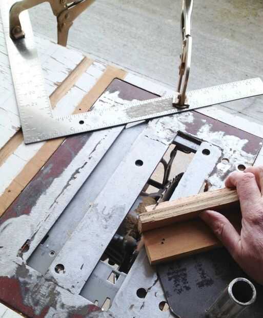 necesito hacer un trineo de inglete para mi sierra de mesa casera, pero por ahora el calibre de ingletes para cortar ingletes encajando el inglete calibre a las piernas de una plaza fijada a la mesa como se ve. La pieza larga en la parte inferior de la funda de transporte tenía que ser exactamente la longitud correcta. Las dos piezas a los lados podrían ser un poco más de tiempo para el ajuste con un simple 90 grados después de un seco buen ajuste de las piezas de corte transversal.
