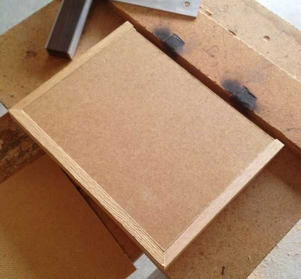 En mi fit dry demostrado aquí los ingletes son agradable y apretado. Las piezas laterales de madera maciza son apenas un poco largas para estar seguro de no cortarlas demasiado cortas. He marcado con un cuchillo afilado y había ajustado para un buen ajuste. Parte de dry fit era probar las esquinas de la fibra para asegurarse de que son cuadrados.