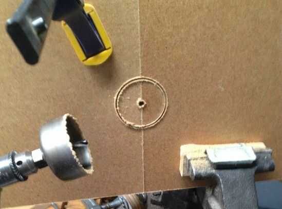usé una sierra del agujero de 2 1/2 pulgada para cortar el semicírculo de las aberturas en los bordes superiores de las piezas de fibra de madera. Cortar simultáneamente como ves en la foto para que fueran exactamente enfrente de uno a otro cuando esté montado el maletín.