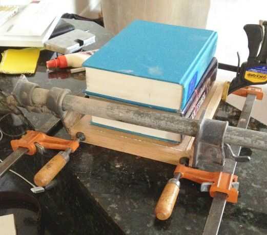 Ver la segunda foto. Después de la mitad de la funda de transporte había secado durante una hora, era seguro pegar el pedazo restante de fibra en su barbilla. Las piezas ya montado y pegado hecho pegar el pedazo restante de fibra en su lugar sin pinzas fácil. Pero, todavía usaba libros pesados para sujetar el pegamento común firmemente mientras se secaba. Coloqué el iPad dentro de la caja para mantener el peso de los libros de distorsión de la fibra.