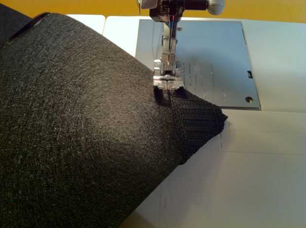 Caliente pegar el elástico es más para sostener el elástico en su lugar. Para fijar realmente, coser en el fieltro con una máquina de coser. Hacer que las puntadas diagonalmente de esquina a esquina con el borde interior del elástico como guía. Tenga cuidado de no coger la parte superior del elástico en su punto. Repita para las 4 esquinas. Una vez que la costura se hace recortar el exceso elástico de 4 esquinas.
