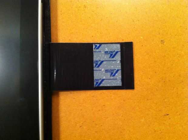 Una vez que el pegamento esté seco. Deslice el iPad en el folio. Cortar un 1 "x 1 3/4" pieza de velcro trasero pegajoso. Conecte un lado del velcro en la parte posterior de la correa de cierre. Pelar el lado opuesto de la cinta de velcro. Envuelva el fleje de cierre en la lateral y frontal de folio presionando la cinta de velcro en lugar.