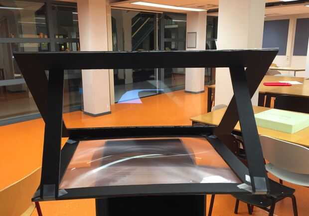 Se trata de un experimento de una cabeza de HUD pantalla con colimación de la luz. Esta simple configuración de un iPad y un lente de Fresnel permite proyecciones de imágenes o películas. Prevé que una aplicación de señalización a prueba las posibilidades de aplicación de esta tecnología en un aeropuerto.