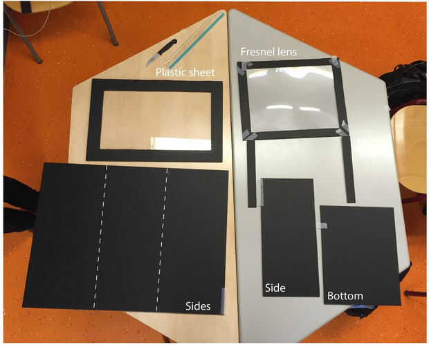 Corte el tablero de la espuma para crear un cuadro de fondo para el ipad (minimizar reflejos en la lente de la luz ambiental). La altura de la caja debe ser la longitud focal de la lente de fresnel, ver siguiendo los pasos.
