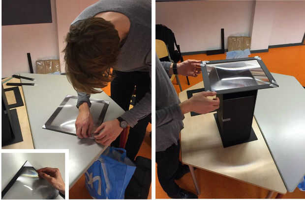 Coloque la lente de Fresnel y su lugar encima de la caja en la correcta distancia focal. Puede hacer ranuras en cada esquina para evitar grabar directamente en la lente.