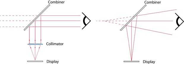 El colimador óptico, en este caso la lente de Fresnel transforma el punto focal de la imagen virtual en infinito. La colimación de la imagen proyectada parece centrarse ahora detrás de la pantalla transparente (combinador) que es lo que refleja la proyección. Sin la lente de colimación, la imagen proyectada aparece en la pantalla del combinador.