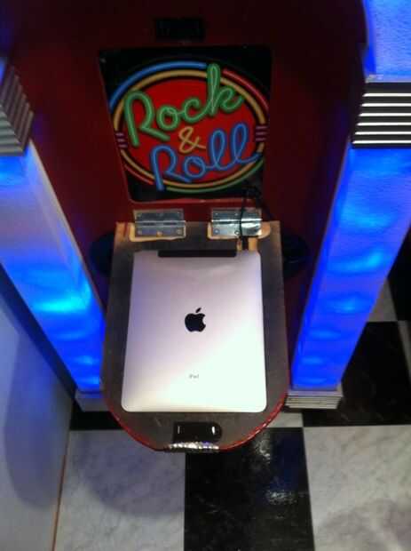 La caja de juke es alimentada por un IPAD (si chicos vota por mí, ojalá, estará equipado con un primer premio - IPAD2). IPAD impulsa un sistema estéreo simple (un amplificador, un par de altavoces y un subwoofer) mediante un cable RCA.