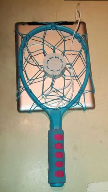 Encontré un conjunto de raquetas de plástico barato en Toys R Us y ordenó un disparador de la cámara alejada por cerca de siete dólares en Amazon.com. Como suerte, pude simplemente estirar la cinta elástica de la raqueta en las esquinas de mi iPad2 para unirla. Esto sostiene el iPad firmemente y con seguridad contra la estructura de plástico por lo que se puede mantener en cualquier dirección.