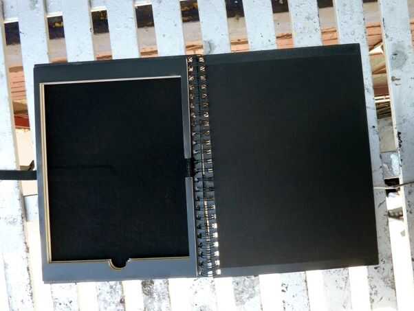 El marco que ha seleccionado obtiene adherido al lado con la cinta de velcro del grosgrain, encima de la tela o papel, con la lengüeta de velcro pequeño que ponemos el marco en el lado del notebook con la espiral.
