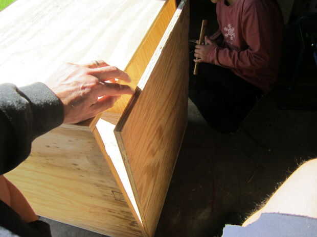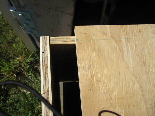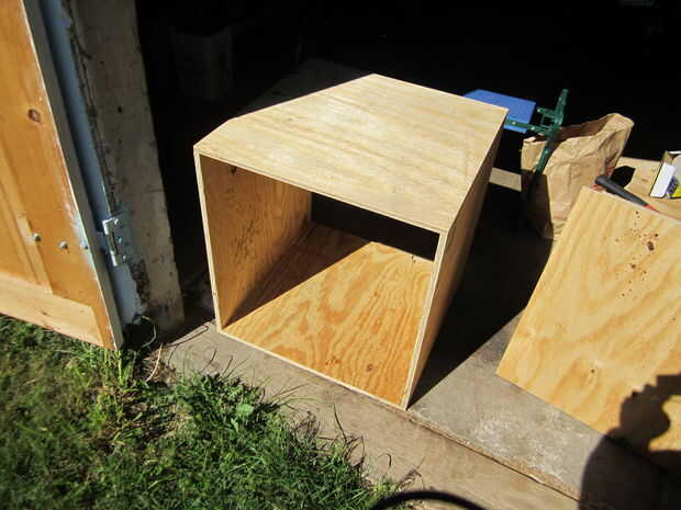 Para evitar todo tormento, quería que la parte posterior de la caja para caber dentro de los lados y la parte superior. Por lo tanto, tuvo que ser un poco menor que 2'x 2'. Es donde la segunda pila de plazas un poco más pequeñas. Poner la caja en su lado por la "espalda" no es arriba y pone la Plaza "posterior" en la parte superior. Tenga en cuenta que el exceso es y cortarlo. Ahora debe encajar. Pegamento y clavos en su lugar.